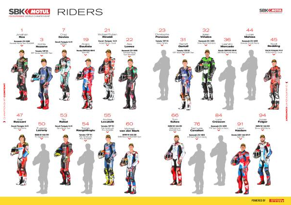 15 44 Lucas Mahias Kawasaki ZX-10RR Kawasaki Puccetti Racing 45 Scott Redding Ducati Panigale V4 R Aruba . it Racing - Ducati 23 Christophe Ponsson Yamaha YZF R1 Alstare Yamaha 31 Garrett Gerloff Yamaha YZF R1 GRT Yamaha WorldSBK Team 32 Isaac Viñales Kawasaki ZX-10RR Orelac Racing Verdnatura 36 Leandro Mercado Honda CBR1000 RR-R MIE Racing Honda Racing 66 Tom Sykes BMW M 1000 RR BMW Motorrad WorldSBK Team 84 Loris Cresson Kawasaki ZX-10RR TPR Team Pedercini Racing 94 Jonas Folger BMW M 1000 RR Bonovo MGM Racing 76 Samuele Cavalieri Kawasaki ZX-10RR TPR Team Pedercini Racing 91 Leon Haslam Honda CBR 1000 RR-R Team HRC POWERED BY CHAMPIONSHIP CONTENT