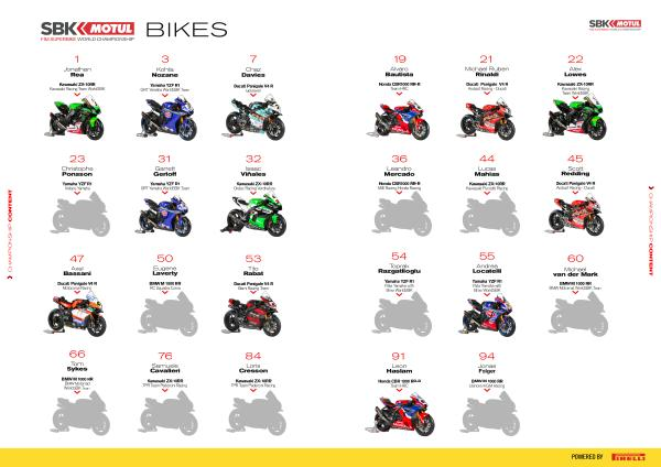 16 BIKES 7 Chaz Davies Ducati Panigale V4 R GoEleven 1 Jonathan Rea Kawasaki ZX-10RR Kawasaki Racing Team WorldSBK 3 Kohta Nozane Yamaha YZF R1 GRT Yamaha WorldSBK Team 23 Christophe Ponsson Yamaha YZF R1 Alstare Yamaha 31 Garrett Gerloff Yamaha YZF R1 GRT Yamaha WorldSBK Team 32 Isaac Viñales Kawasaki ZX-10RR Orelac Racing Verdnatura 47 Axel Bassani Ducati Panigale V4 R Motocorsa Racing 50 Eugene Laverty BMW M 1000 RR RC Squadra Corsa 53 Tito Rabat Ducati Panigale V4 R Barni Racing Team 66 Tom Sykes BMW M 1000 RR BMW Motorrad WorldSBK Team 84 Loris Cresson Kawasaki ZX-10RR TPR Team Pedercini Racing 76 Samuele Cavalieri Kawasaki ZX-10RR TPR Team Pedercini Racing CHAMPIONSHIP CONTENT