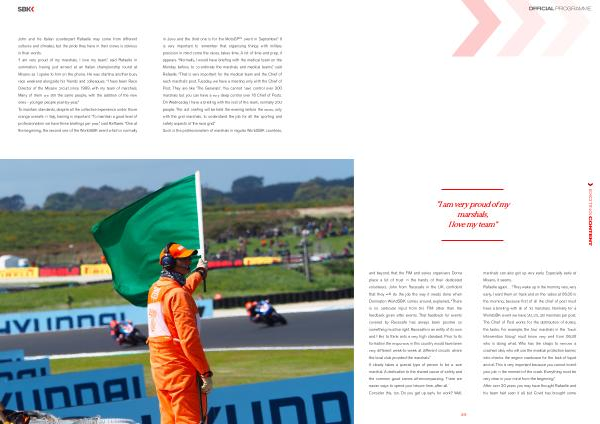 John and his Italian counterpart Rafaelle may come from different cultures and climates , but the pride they have in their crews is obvious in their words . “ I am very proud of my marshals , I love my team ,” said Rafaelle in summation , having just arrived at an Italian championship round at Misano as I spoke to him on the phone . He was starting another busy race weekend alongside his friends and colleagues . “ I have been Race Director of the Misano circuit since 1999 , with my team of marshals . Many of them are still the same people , with the addition of the new ones - younger people year-by-year .” To maintain standards , despite all the collective experience under those orange overalls in Italy , training is important . “ To maintain a good level of professionalism we have three briefings per year ,” said Raffaele . “ One at the beginning , the second one of the WorldSBK event which is normally in June and the third one is for the MotoGP™ event in September .” It is very important to remember that organising things with military precision in mind come the races , takes time . A lot of time and prep , it appears . “ Normally , I would have briefing with the medical team on the Monday before , to co-ordinate the marshals and medical teams ,” said Rafaelle . “ That is very important for the medical team and the Chief of each marshal ’ s post . Tuesday , we have a meeting only with the Chief of Post . They are like ‘ The Generals ’. You cannot have control over 300 marshals but you can have a very deep control over 16 Chief of Posts . On Wednesday I have a briefing with the rest of the team , normally 250 people . The last briefing will be held the evening before the races , only with the grid marshals , to understand the job for all the sporting and safety aspects of the race grid .” Such is the professionalism of marshals in regular WorldSBK countries ,