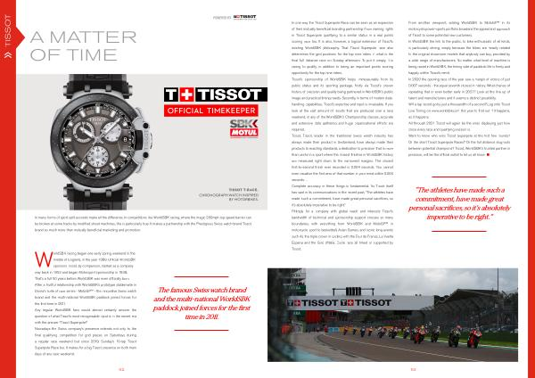 WorldSBK racing began one early spring weekend in the middle of England , in the year 1988 . Official WorldSBK sponsors Tissot , by comparison , started as a company way back in 1853 and began Motorsport sponsorship in 1938 . That ’ s a full 50 years before WorldSBK was even officially born . After a fruitful relationship with WorldSBK ’ s prototype stablemate in Dorna ’ s suite of race series - MotoGP™ - the innovative Swiss watch brand and the multi-national WorldSBK paddock joined forces for the first time in 2011 . Any regular WorldSBK fans would almost certainly answer the question of what Tissot ’ s most recognisable input is in the recent era with the answer “ Tissot Superpole !” Nowadays the Swiss company ’ s presence extends not only to the final qualifying competition for grid places on Saturdays during a regular race weekend but since 2019 , Sunday ’ s 10-lap Tissot Superpole Race too . It makes for a big Tissot presence on both main days of any race weekend .