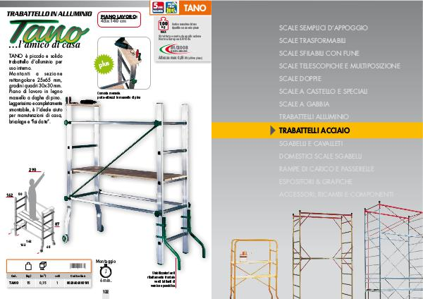 TANO è piccolo e solido trabattello d’ alluminio per uso interno. Montanti a sezione rettangolare 25x65 mm, gradini quadri 30x30 mm. Piano di lavoro in legno massello a doghe di pino. Leggerissimo e completamente smontabile, è l’ ideale aiuto per manutenzioni di casa, bricolage e“ fai da te”. plus