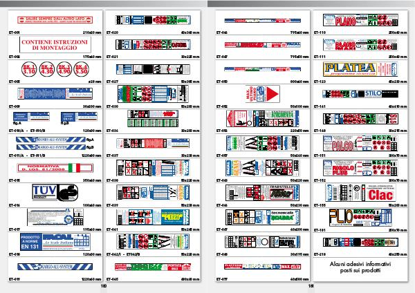 181 ET-046 795x40 mm ET-047 795x50 mm ET-050 800x40 mm ET-052 50x100 mm ET-056 220x50 mm ET-057 50x240 mm ET-063 50x220 mm ET-066 50x230 mm ET-067 40x200 mm ET-068 30x195 mm ET-077 40x580 mm ET-110 250x40 mm ET-111 250x40 mm ET-123 45x230 mm ET-141 40x410 mm ET-148 30x215 mm ET-151 330x70 mm ET-152 330x70 mm ET-155 50x200 mm ET-181 250x70 mm ET-218 40x250 mm Alcuni adesivi informativi posti sui prodotti