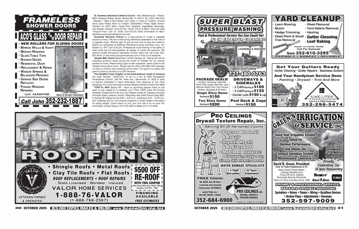 St. Andrews Ukrainian Catholic Church – Rev. Mikhail Kouts – Pastor; 8064 Weeping Willow Street, Brooksville, Fl 34613, Tel.( 352) 596-2433- Masses – Daily & Sat 6:00pm, Sun 10am 11:15am & 12:30pm. Church Store open Friday Noon to 5:00pm. Oktoberfest“ Friday Night Dinner” October 10, 2025. Menu: Roast Pork, Spaetzle, Vegetables. Beverage, and dessert included. Cost $ 12.00. Hours 4:30 to 6:30pm. Save the date – Soup-A-Thon,” Jan. 31, 2026. Cost $ 10.00. More information @ http:// standrewsukrainiancatholicchurch. com.