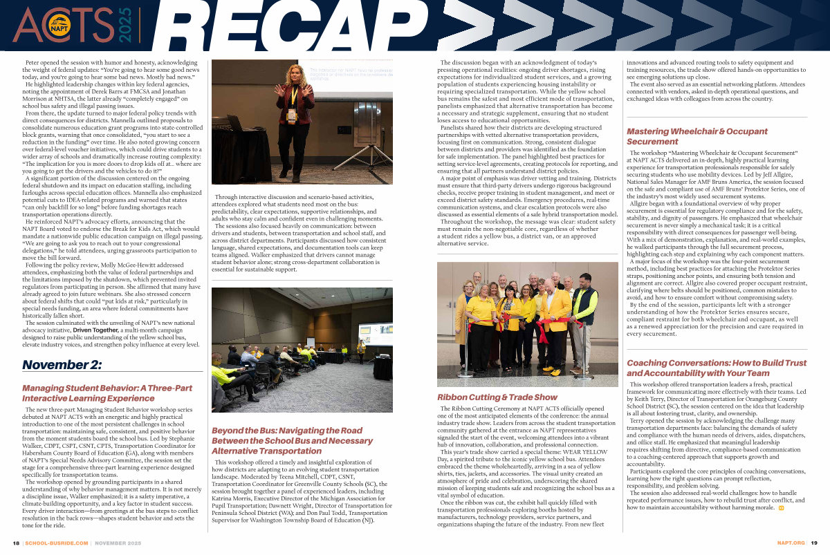 Peter opened the session with humor and honesty, acknowledging the weight of federal updates:“ You’ re going to hear some good news today, and you’ re going to hear some bad news. Mostly bad news.” He highlighted leadership changes within key federal agencies, noting the appointment of Derek Barrs at FMCSA and Jonathan Morrison at NHTSA, the latter already“ completely engaged” on school bus safety and illegal passing issues. From there, the update turned to major federal policy trends with direct consequences for districts. Mannella outlined proposals to consolidate numerous education grant programs into state-controlled block grants, warning that once consolidated,“ you start to see a reduction in the funding” over time. He also noted growing concern over federal-level voucher initiatives, which could drive students to a wider array of schools and dramatically increase routing complexity:“ The implication for you is more doors to drop kids off at … where are you going to get the drivers and the vehicles to do it?” A significant portion of the discussion centered on the ongoing federal shutdown and its impact on education staffing, including furloughs across special education offices. Mannella also emphasized potential cuts to IDEA-related programs and warned that states“ can only backfill for so long” before funding shortages reach transportation operations directly. He reinforced NAPT’ s advocacy efforts, announcing that the NAPT Board voted to endorse the Break for Kids Act, which would mandate a nationwide public education campaign on illegal passing.“ We are going to ask you to reach out to your congressional delegations,” he told attendees, urging grassroots participation to move the bill forward. Following the policy review, Molly McGee-Hewitt addressed attendees, emphasizing both the value of federal partnerships and the limitations imposed by the shutdown, which prevented invited regulators from participating in person. She affirmed that many have already agreed to join future webinars. She also stressed concern about federal shifts that could“ put kids at risk,” particularly in special needs funding, an area where federal commitments have historically fallen short. The session culminated with the unveiling of NAPT’ s new national advocacy initiative, Driven Together, a multi-month campaign designed to raise public understanding of the yellow school bus, elevate industry voices, and strengthen policy influence at every level.