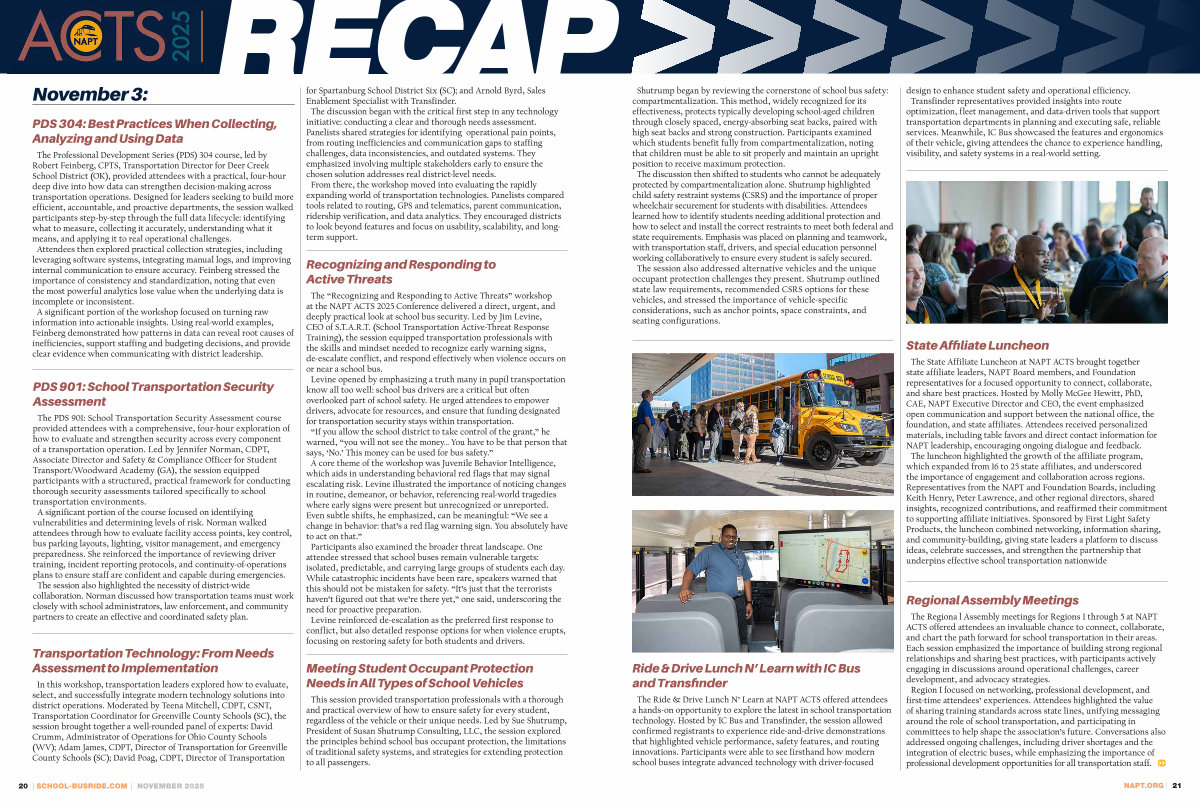 The“ Recognizing and Responding to Active Threats” workshop at the NAPT ACTS 2025 Conference delivered a direct, urgent, and deeply practical look at school bus security. Led by Jim Levine, CEO of S. T. A. R. T.( School Transportation Active-Threat Response Training), the session equipped transportation professionals with the skills and mindset needed to recognize early warning signs, de‐escalate conflict, and respond effectively when violence occurs on or near a school bus. Levine opened by emphasizing a truth many in pupil transportation know all too well: school bus drivers are a critical but often overlooked part of school safety. He urged attendees to empower drivers, advocate for resources, and ensure that funding designated for transportation security stays within transportation.“ If you allow the school district to take control of the grant,” he warned,“ you will not see the money … You have to be that person that says,‘ No.’ This money can be used for bus safety.” A core theme of the workshop was Juvenile Behavior Intelligence, which aids in understanding behavioral red flags that may signal escalating risk. Levine illustrated the importance of noticing changes in routine, demeanor, or behavior, referencing real‐world tragedies where early signs were present but unrecognized or unreported. Even subtle shifts, he emphasized, can be meaningful:“ We see a change in behavior: that’ s a red flag warning sign. You absolutely have to act on that.” Participants also examined the broader threat landscape. One attendee stressed that school buses remain vulnerable targets: isolated, predictable, and carrying large groups of students each day. While catastrophic incidents have been rare, speakers warned that this should not be mistaken for safety.“ It’ s just that the terrorists haven’ t figured out that we’ re there yet,” one said, underscoring the need for proactive preparation. Levine reinforced de‐escalation as the preferred first response to conflict, but also detailed response options for when violence erupts, focusing on restoring safety for both students and drivers.