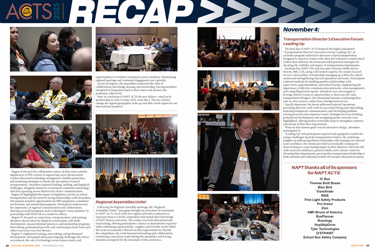 The final day of NAPT ACTS featured the highly anticipated“ Transportation Director’ s Executive Forum: Leading Up,” an exclusive program tailored for directors’ school transportation. Designed to empower leaders who often feel unheard or undervalued within their districts, the forum provided practical strategies for elevating the visibility and impact of transportation departments. Facilitated by NAPT CEO and Executive Director Molly McGee Hewitt, PhD, CAE, along with invited experts, the session focused on two critical pillars of leadership: managing up within the school system and strengthening internal operations and teams. Participants explored methods for building positive relationships with supervisors, superintendents, and school boards, emphasizing the importance of effective communication protocols, crisis management, and compelling board reports. Attendees were encouraged to leverage district events as opportunities to showcase the value transportation brings to the educational mission, reinforcing their unit as a key resource rather than a background service. Equally important, the forum addressed internal operations, providing directors with tools for successful hiring and onboarding, fostering transparent communication, and developing problemsolving processes that empower teams. Strategies for team building, professional development, and navigating parent concerns were highlighted, offering leaders actionable steps to strengthen cohesion and morale within their departments. What set this session apart was its interactive design. Attendees participated in“ Leading Up” left participants inspired and equipped to tackle the unique challenges faced by transportation leaders. By combining insights on influencing district leadership with strategies for internal team excellence, the session provided an invaluable roadmap for those looking to create lasting impact in their districts. Directors left with renewed confidence, practical skills, and a clearer vision for elevating their departments, proving that transportation leadership is both essential and influential within the broader educational system.