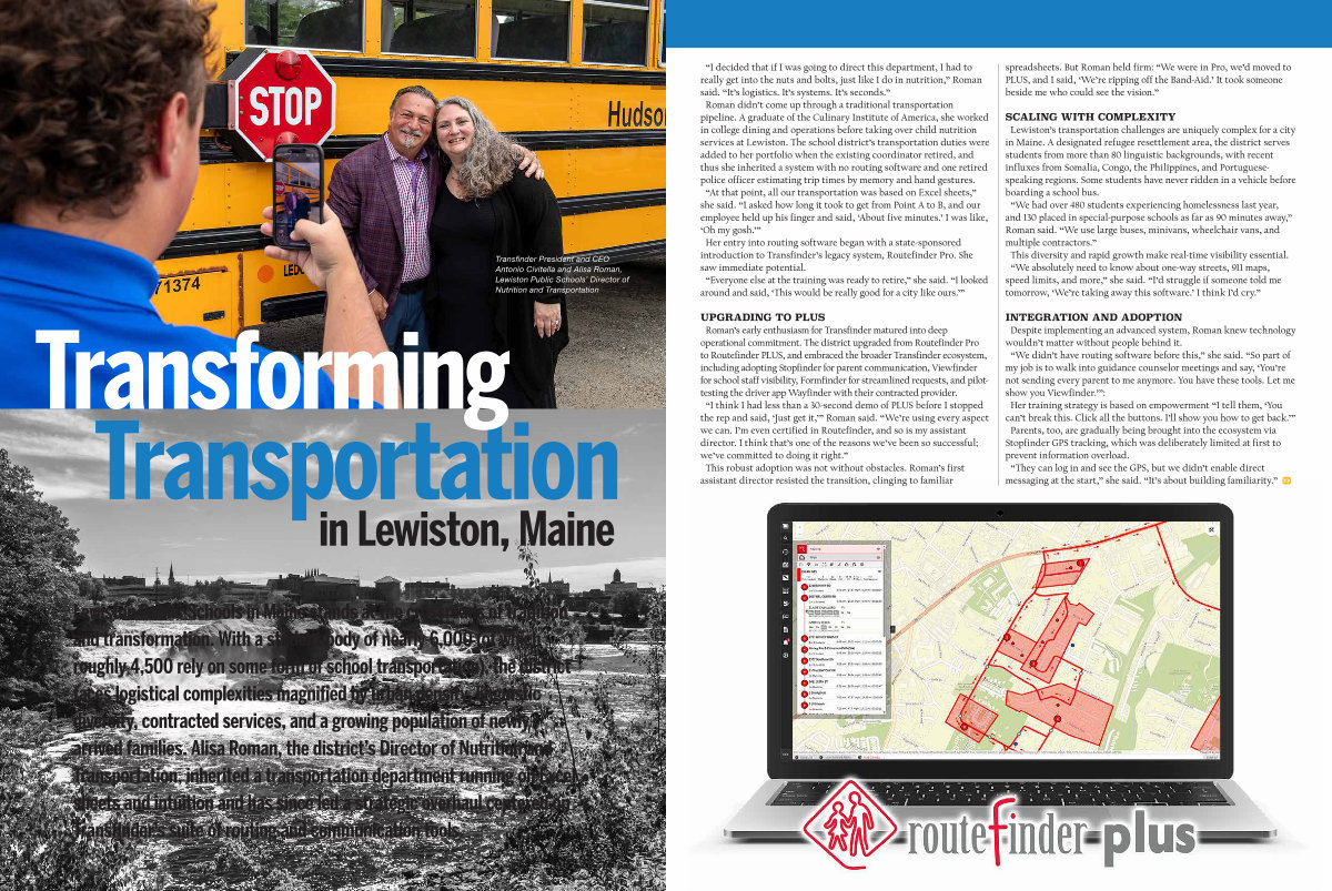 Lewiston Public Schools in Maine stands at the crossroads of tradition and transformation. With a student body of nearly 6,000( of which roughly 4,500 rely on some form of school transportation), the district faces logistical complexities magnified by urban density, linguistic diversity, contracted services, and a growing population of newly arrived families. Alisa Roman, the district’ s Director of Nutrition and Transportation, inherited a transportation department running on Excel sheets and intuition and has since led a strategic overhaul centered on Transfinder’ s suite of routing and communication tools.