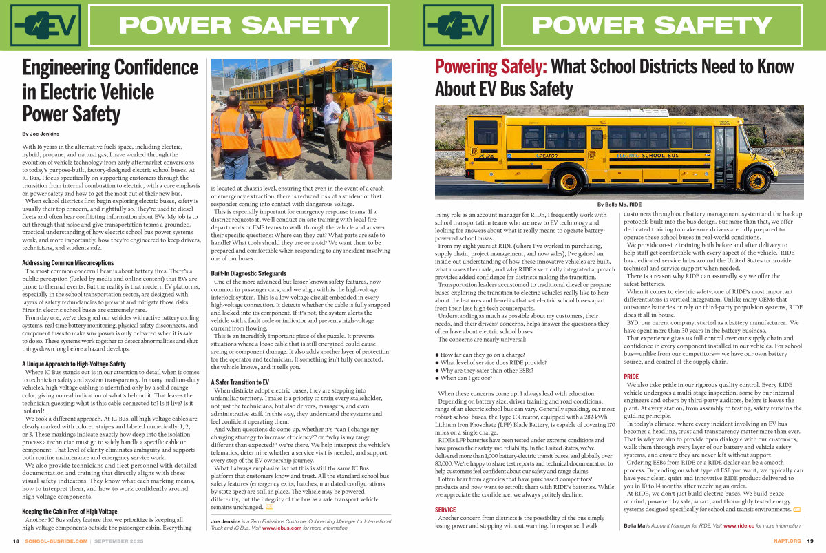 A Safer Transition to EV When districts adopt electric buses, they are stepping into unfamiliar territory. I make it a priority to train every stakeholder, not just the technicians, but also drivers, managers, and even administrative staff. In this way, they understand the systems and feel confident operating them. And when questions do come up, whether it’ s“ can I change my charging strategy to increase efficiency?” or“ why is my range different than expected?” we’ re there. We help interpret the vehicle’ s telematics, determine whether a service visit is needed, and support every step of the EV ownership journey. What I always emphasize is that this is still the same IC Bus platform that customers know and trust. All the standard school bus safety features( emergency exits, hatches, mandated configurations by state spec) are still in place. The vehicle may be powered differently, but the integrity of the bus as a safe transport vehicle remains unchanged.