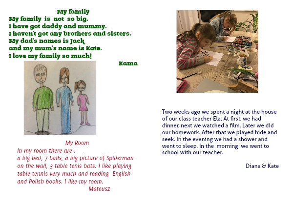 a big bed, 7 balls, a big picture of Spiderman on the wall, 3 table tenis bats. I like playing table tennis very much and reading English and Polish books. I like my room.