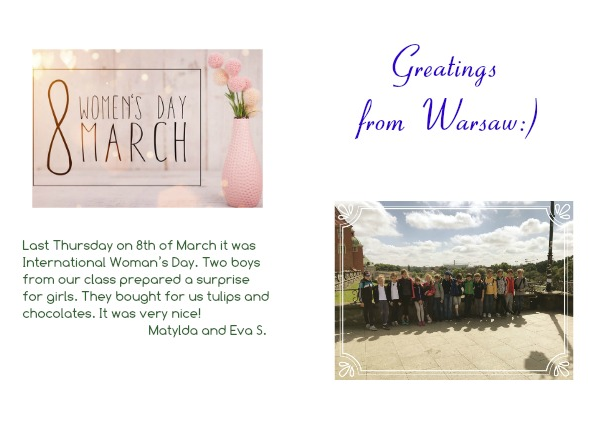 Last Thursday on 8th of March it was International Woman’s Day. Two boys from our class prepared a surprise for girls. They bought for us tulips and chocolates. It was very nice!