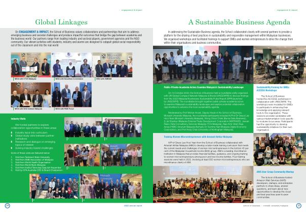 On 14 October 2022 , the School of Business held a roundtable jointly organised with UN Global Compact Network Malaysia & Brunei ( UNGCMYB ) to discuss findings from the 2022 Malaysia Businesses Sustainability Pulse Report ( SPR ) launched by UNGCMYB . The roundtable brought together public-private-academia actors to examine Malaysia ’ s sustainability landscape and explore potential collaboration opportunities to advance the local sustainability agenda .
