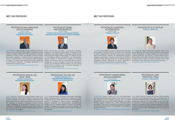 JANE chairs the Equity , Diversity and Inclusion ( EDI ) Committee at Monash University Malaysia . She is also an associate editor of the Journal of Asian Business and Management . A cross-cultural management researcher , her work appears in top-tier journals . Recognised for her teaching excellence , she has received multiple awards and led significant roles in academic leadership . She holds an Master of Business Administration from the Chinese University of Hong Kong and a PhD in Management from the University of Manchester . > research . monash . edu / en / persons / jane-tong p 25
