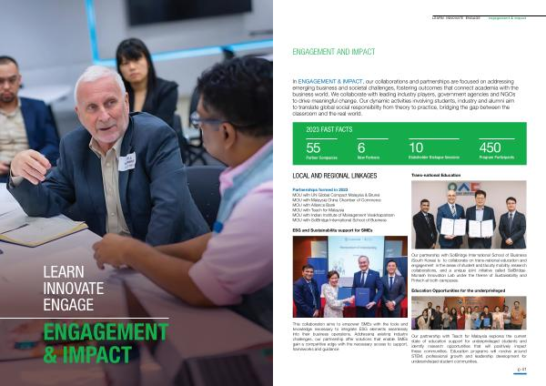 In ENGAGEMENT & IMPACT , our collaborations and partnerships are focused on addressing emerging business and societal challenges , fostering outcomes that connect academia with the business world . We collaborate with leading industry players , government agencies and NGOs to drive meaningful change . Our dynamic activities involving students , industry and alumni aim to translate global social responsibility from theory to practice , bridging the gap between the classroom and the real world .