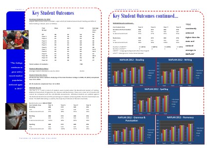 NAPLAN Results con nued... Curriculum Area Grammar & Punctua on TCC % above benchmark Numeracy TCC % above benchmark Year 3 268 430 95% 268 408 98% Year 5 372 551 97% 372 521 98% 24(40%) 0 Year 7 424 549 97% 424 533 100% 24 (38%) 1 Year 9 476 587 95% 476 587 96% 17 (26%) 1