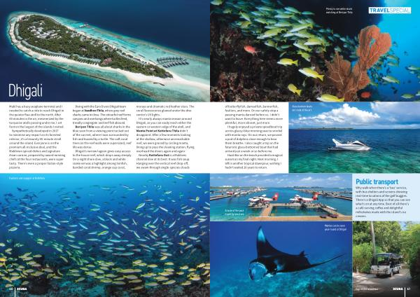 Dhigali’ s narrow lagoon gives easy access to the house reef, which drops away steeply. On a night shore dive, a black and white snake eel was a highlight among lionfish, banded coral shrimp, orange cup coral, morays and dramatic red feather stars. The coral fluorescence glowed under the dive centre’ s UV lights.