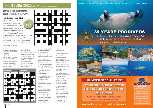 Please print out and fill in your completed crossword, then scan the print( or take a good quality telephone photo) of the completed puzzle and email to simon @ scubamagazine. co. uk Make sure you include which month of SCUBA the crossword appeared in, your full name, email address and a contact number. One winner will be selected at random and will receive a prize of £ 50.