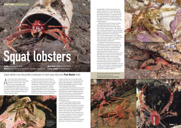 In addition to these three most obvious squat lobsters, several further species live around the British Isles. One example is the very small( less than 2 cm long) Galathea intermedia with large red eyes and often a pale stripe down its back. Close-up photographs can reveal tiny blue spots on its generally red carapace and a set of brilliant iridescent-blue marks around its head and mouthparts. There is an interesting story here, with scientists concluding that these head marks may have a function in communication between individuals. As I say so often in Critter, there is always more going on among the residents of our underwater world than we might imagine! �