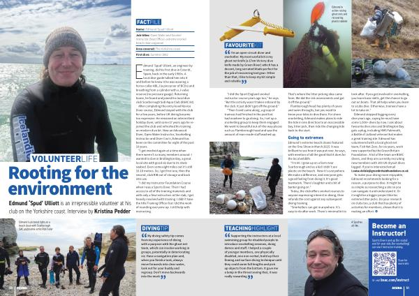 Edmund stopped logging every dive years ago, saying he must have some 1,000 + dives by now. I ask about favourite dive sites and Bridlington Bay gets a plug, including HMS Falmouth, a Battle of Jutland veteran that makes a great training site. Edmund has volunteered with a local ghost net team, Fish Net Zero, for six years, work now supported by the Green Britain Foundation. A lot of the team are BSAC divers, and they are currently recruiting new members with 100 UK drysuit dives logged. If you’ re interested email Louise. delisle @ greenbritainfoundation. co. uk