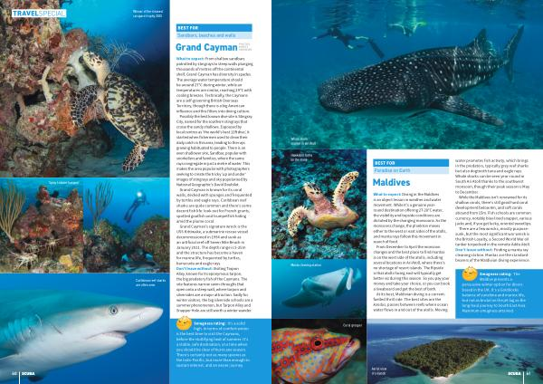 What to expect: Diving in the Maldives is an object lesson in weather and water movement. While it’ s a genuine yearround destination offering 27-28 ° C water, the visibility and topside conditions are dictated by the changing monsoons. As the monsoons change, the plankton moves either to the west or east sides of the atolls, and manta rays follow this movement in search of food.
