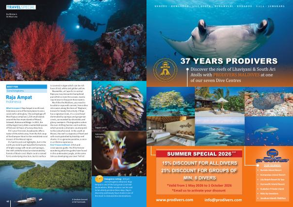 Much like the Maldives, you need to be able to cope with current, hence dive site names along the lines of‘ Mayhem’, known for heady fish activity. If Raja has a signature look, it’ s a coral head dominated by sponges and gorgonian corals, surrounded by silversides and glassy sweepers. Photographers adore the ever-shifting fusiliers and sardines, which provide a dramatic counterpoint to the colourful coral. In the south at Misool, the reef is a tapestry of hard and soft corals patrolled by blacktip reef sharks. It is a genuine paradise, a oncein-a-lifetime experience. Don’ t leave without: A fish and coral species guide. You’ ll be forever wondering what the guides have found in this underwater jungle, at the same time as developing your own‘ hit list’.