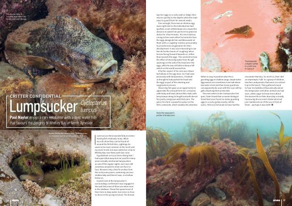 A guidebook on local shore diving that I had squirrelled away but not used for many years actually mentioned lumpsuckers as one of the regular sights , but I was still somehow amazed to meet one face-toface . We were only a few fin strokes from the rocky entry point , swimming out over shallow kelp and there it was , in a hollow below us .