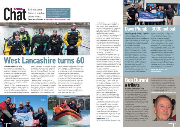 Our aim this year is to celebrate our 60 years in as many ways as possible , the main event being a dinner in St Annes in October . We have already contacted many past members who will be attending the dinner , but if there are any SCUBA readers who are past members , you too are welcome to join us or perhaps share some memories of your time with the club . You can contact us by email at info @ bsac-153 . co . uk PETER HALL , Chair , West Lancashire SAC