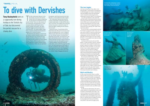 So it was , on day four of our , ahem , ‘ nondiving holiday ’, we boarded our diving boat on the Manavgat river at 8am , motored out onto the Mediterranean Sea and headed north . It took 60 minutes to get to the underwater museum , which is 1.5m offshore . I was diving with Barracuda Club Side , with the owner of the boat and dive master Ismail Toga . We had 15 divers onboard and most of them were continuing their dive training and doing their first open water dive , so we got in first . Equipment wasn ’ t exactly the finest quality , but I didn ’ t have any issues with it .