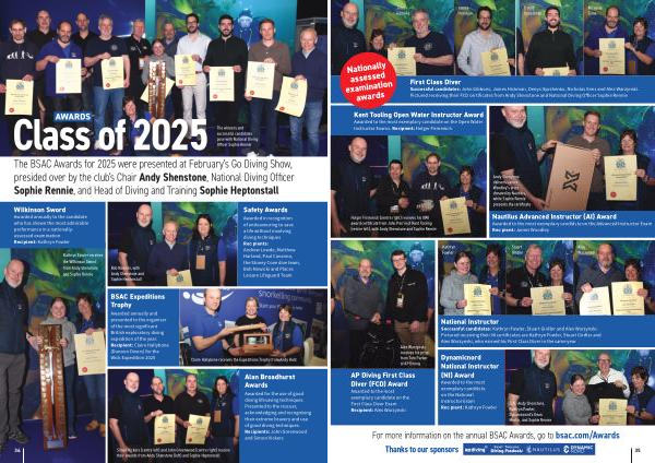 The BSAC Awards for 2025 were presented at February’ s Go Diving Show, presided over by the club’ s Chair Andy Shenstone, National Diving Officer Sophie Rennie, and Head of Diving and Training Sophie Heptonstall