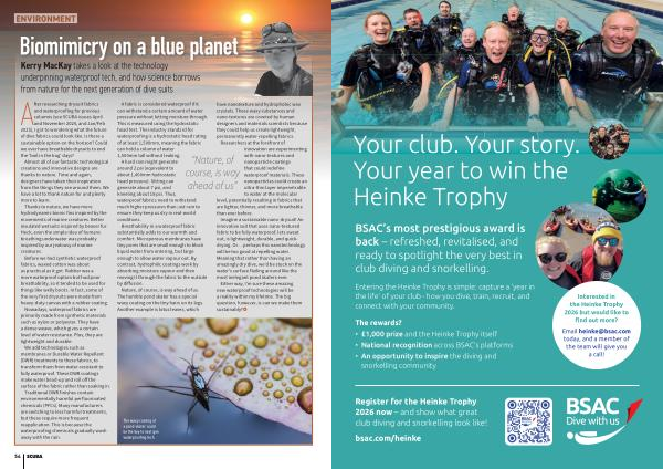 After researching drysuit fabrics and waterproofing for previous columns( see SCUBA issues April and November 2024, and Jan / Feb 2025), I got to wondering what the future of dive fabrics could look like. Is there a sustainable option on the horizon? Could we ever have breathable drysuits to end the‘ boil in the bag’ days?