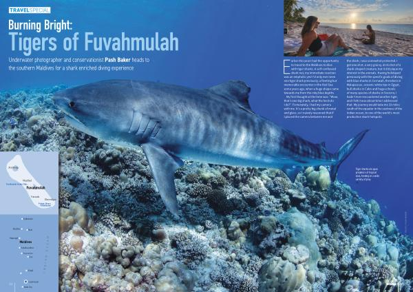 Earlier this year I had the opportunity to travel to the Maldives to dive with tiger sharks. A self-confessed shark nut, my immediate reaction was an emphatic yes! I’ d only ever seen one tiger shark previously, a fleeting but memorable encounter in the Red Sea some years ago, when a huge shape came towards me from the inky blue depths.