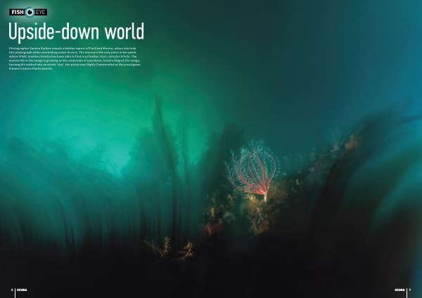 Photographer Sandra Stalker reveals a hidden aspect of Portland Marina, where she took this photograph while snorkelling under licence. The marina is the only place in her patch where IPSAC member Sandra has been able to find rosy feather stars, Antedon bifeda. The marine life in the image is growing on the underside of a pontoon; Sandra flipped the image, turning the seabed into an ersatz‘ sky’. Her photo was Highly Commended at the prestigious Sienna Creative Photo Awards.