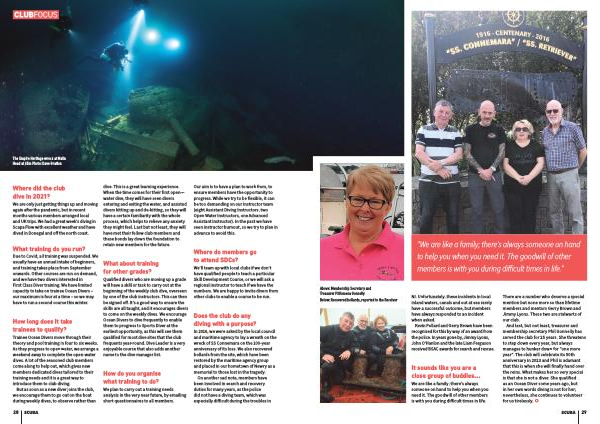 Qualified divers who are moving up a grade will have a skill or task to carry out at the beginning of the weekly club dive , overseen by one of the club instructors . This can then be signed off . It ’ s a good way to ensure the skills are all taught , and it encourages divers to come on the weekly dives . We encourage Ocean Divers to dive frequently to enable them to progress to Sports Diver at the earliest opportunity , as this will see them qualified for most dive sites that the club frequents year-round . Dive Leader is a very enjoyable course that also adds another name to the dive manager list .