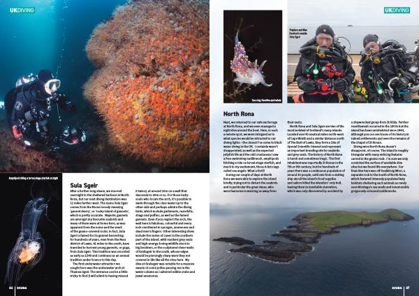 Next , we returned to our safe anchorage at North Rona , and we even managed a night dive around the boat . Here , in such a remote spot , we were intrigued as to what species would be attracted to our diving lights – the closest I ’ ve come to black water diving in the UK . I certainly wasn ’ t disappointed ; as well as the expected jellyfish life and the odd crustacean I saw a free-swimming nudibranch , amphipods hitching a ride on larval-stage starfish , and much to my excitement , those A-list slugs called sea angels . What a thrill !