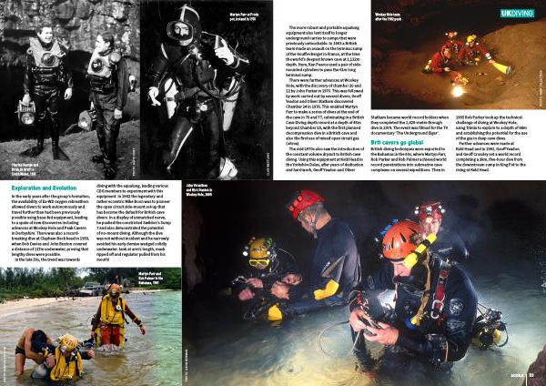 In the late 50s , the trend was towards diving with the aqualung , leading various CDG members to experiment with this equipment . In 1962 the legendary and rather eccentric Mike Boon was to pioneer the open circuit side-mount set-up that has become the default for British cave divers . In a display of unmatched nerve , he pushed the constricted Swildon ’ s Sump 7 and also demonstrated the potential of no-mount diving . Although the dive was not without incident and he narrowly avoided his early demise wedged solidly underwater , tank at arm ’ s length , mask ripped off and regulator pulled from his mouth !