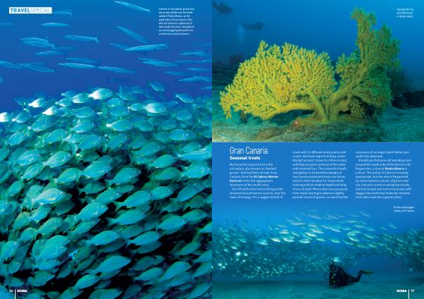 Schools of roncadores grunts and barracuda collide over the white sands of Pasita Blanca , on the south side of Gran Canaria . This dive site features a gathering of man-made structures designed to act as fish aggregation points for a university research project .