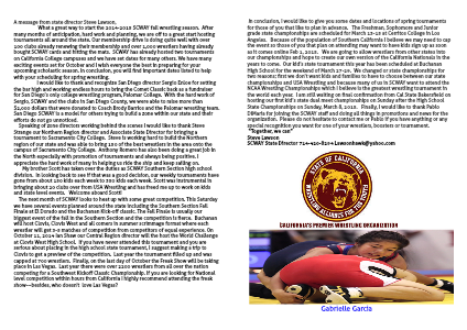 In conclusion, I would like to give you some dates and locations of spring tournaments for those of you that like to plan in advance. The Freshman, Sophomore and Junior grade state championships are scheduled for March 13-15 at Cerritos College in Los Angeles. Because of the population of Southern California I believe we may need to cap the event so those of you that plan on attending may want to have kids sign up as soon as it comes online Feb 1, 2015. We are going to allow wrestlers from other states into our championships and hope to create our own version of the California Nationals in the years to come. Our kid’s state tournament this year has been scheduled at Buchanan High School for the weekend of March 27-29. We changed or state championships for two reasons; first we don’t want kids and families to have to choose between our state championships and USA Wrestling and because many of us in SCWAY want to attend the NCAA Wrestling Championships which I believe is the greatest wrestling tournament in the world each year. I am still waiting on final confirmation from Cal State Bakersfield on hosting our first kid’s state dual meet championships on Sunday after the High School State Championships on Sunday, March 8, 2015. Finally, I would like to thank Pablo DiMaria for joining the SCWAY staff and doing all things in promotions and news for the organization. Please do not hesitate to contact me or Pablo if you have anything or any special recognition you want for one of your wrestlers, boosters or tournament.