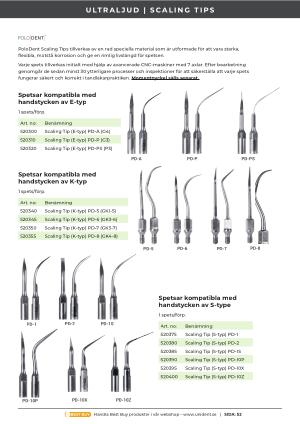 1 spets / förp . Art . no : Benämning caling Tips are manufactured from a range of special materials , which are designed to be strong , flexible , resist corrosion 520300 Scaling Tip ( E-typ ) PD-A ( G4 )