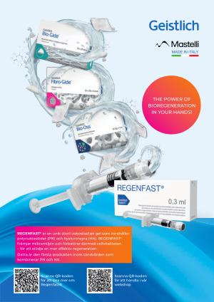REGENFAST ® är en unik steril viskoelastisk gel som innehåller polynukleotider ( PN ) och hyaluronsyra ( HA ). REGENFAST ® främjar mikromiljön och förbättrar därmed cellvitaliteten – för att stödja en mer effektiv regeneration . Detta är den första produkten inom tandvården som kombinerar PN och HA .