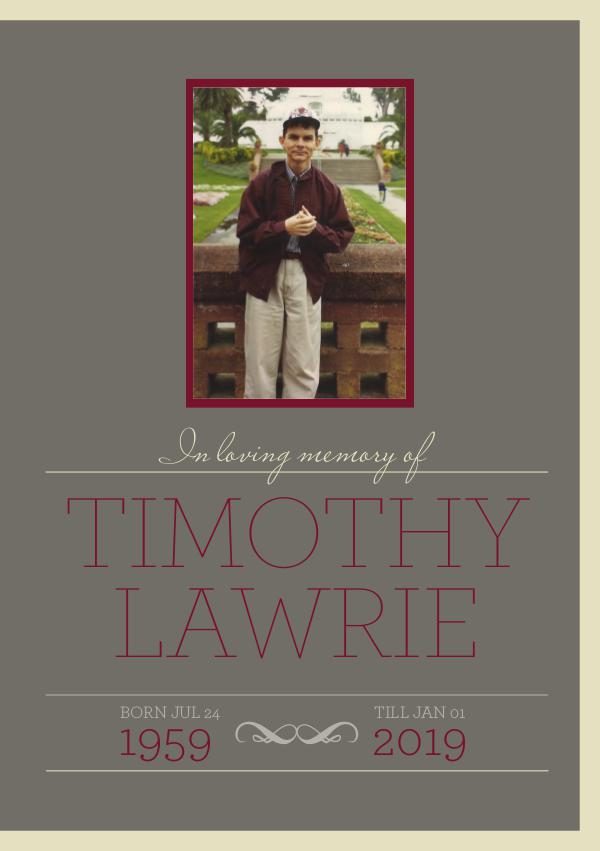 In loving memory of TIMOTHY LAWRIE BORN JUL 24 1959 TILL JAN 01 2019