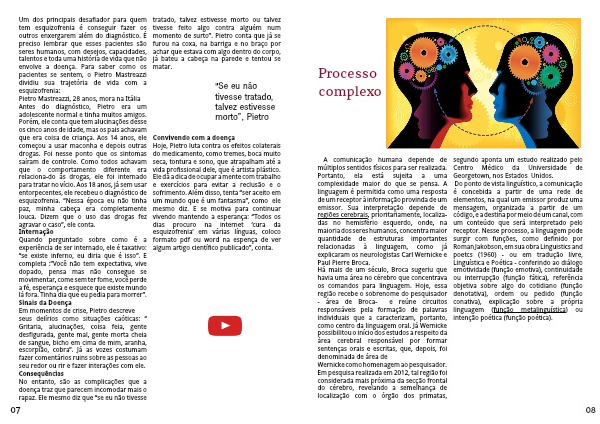 Antes do diagnóstico, Pietro era um adolescente normal e tinha muitos amigos. Porém, ele conta que tem alucinações desse os cinco anos de idade, mas os pais achavam que era coisa de criança. Aos 14 anos, ele começou a usar maconha e depois outras drogas. Foi nesse ponto que os sintomas saíram de controle. Como todos achavam que o comportamento diferente era relaciona-do às drogas, ele foi internado para tratar no vício. Aos 18 anos, já sem usar entorpecentes, ele recebeu o diagnóstico de esquizofrenia. “Nessa época eu não tinha paz, minha cabeça era completamente louca. Dizem que o uso das drogas fez agravar o caso”, ele conta.