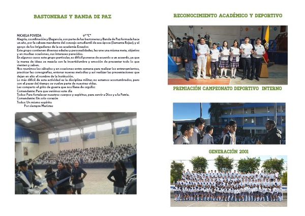 Alegría, coordinación y Elegancia, son parte de las bastoneras y Banda de Paz formada hace un año, por la cabeza mandante del consejo estudiantil de esa época (Samanta Rojas), y el apoyo de los brigadieres de la ex academia Ecuador.