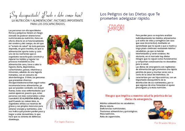 Las personas con discapacidades físicas y psíquicas tienen un riesgo elevado de padecer alteraciones nutricionales. La nutrición, tiene un efecto directo en el funcionamiento del cerebro y del cuerpo, de ahí que el “estado de salud” de toda persona dependa, en gran medida, de que la alimentación aporte todos y cada uno de los nutrientes que el organismo necesita para construir y reparar los tejidos y regular los procesos metabólicos. Una alimentación sana, lleva a cabo la ingesta diaria, de proteínas, carbohidratos, grasas, vitaminas y minerales, además de una ingesta hidrantes, con el consumo de abundante agua. Si bien, las personas que presentan diversas discapacidades necesitan seguir estas recomendaciones alimentarias, ya que así pueden combatir, con mayor fuerza, todas esas enfermedades que suelen aparecer, puesto que, estas personas son más vulnerables a ellas cuando NO SE ALIMENTAN BIEN. ¿Por qué? Cuando no comen bien, su organismo utiliza sus reservas de grasas y sus propios músculos para obtener energía y nutrientes, esto nos indica que pueden perder peso y llegar a estar desnutridas, lo que hace que su sistema de defensas disminuya.