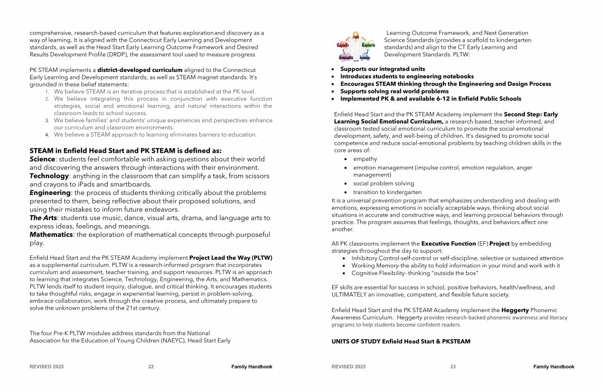 Enfield Head Start and the PK STEAM Academy implement Project Lead the Way( PLTW) as a supplemental curriculum. PLTW is a research-informed program that incorporates curriculum and assessment, teacher training, and support resources. PLTW is an approach to learning that integrates Science, Technology, Engineering, the Arts, and Mathematics. PLTW lends itself to student inquiry, dialogue, and critical thinking. It encourages students to take thoughtful risks, engage in experiential learning, persist in problem-solving, embrace collaboration, work through the creative process, and ultimately prepare to solve the unknown problems of the 21st century.