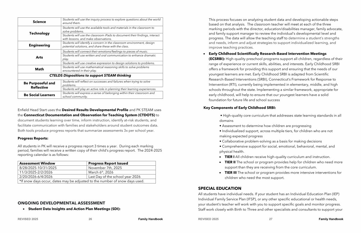 This process focuses on analyzing student data and developing actionable steps based on that analysis. The classroom teacher will meet at each of the three marking periods with the director, education / disabilities manager, family advocate, and family support manager to review the individual’ s developmental level and progress. The data will allow the teaching staff to determine a student’ s strengths and needs, inform and adjust strategies to support individualized learning, and improve teaching practices.