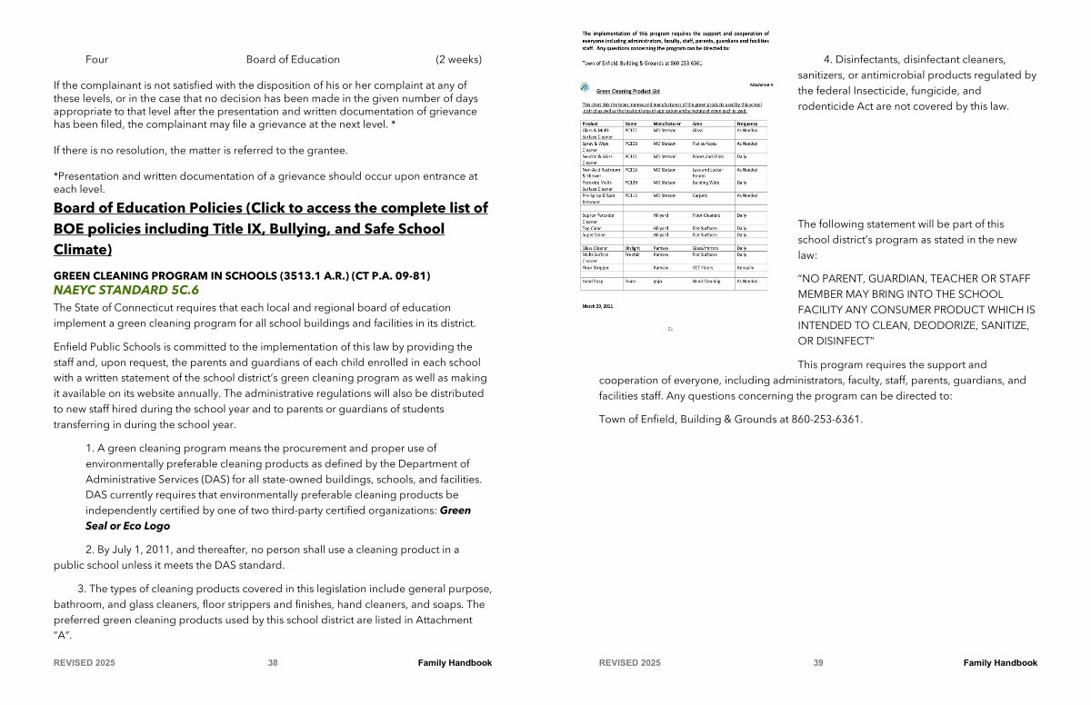 Enfield Public Schools is committed to the implementation of this law by providing the staff and, upon request, the parents and guardians of each child enrolled in each school with a written statement of the school district’ s green cleaning program as well as making it available on its website annually. The administrative regulations will also be distributed to new staff hired during the school year and to parents or guardians of students transferring in during the school year.