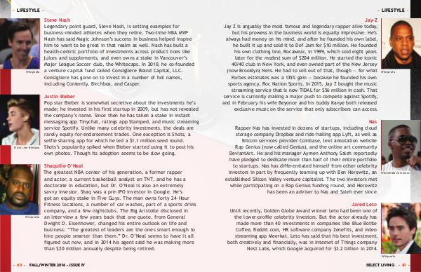 Justin Bieber Pop star Bieber is somewhat secretive about the investments he’ s made; he invested in his first startup in 2009, but has not revealed the company’ s name. Since then he has taken a stake in instant messaging app Tinychat, ratings app Stamped, and music streaming service Spotify. Unlike many celebrity investments, the deals are rarely equity-for-endorsement trades. One exception is Shots, a selfie sharing app for which he led a $ 1.1 million seed round. Shots’ s popularity spiked when Bieber started using it to post his own photos. Though its adoption seems to be slow going.