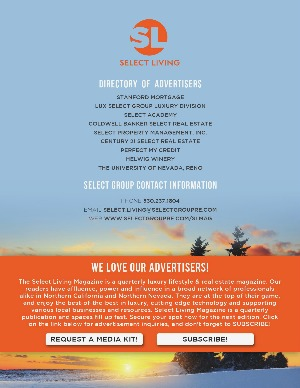 The Select Living Magazine is a quarterly luxury lifestyle & real estate magazine. Our readers have affluence, power and influence in a broad network of professionals alike in Northern California and Northern Nevada. They are at the top of their game, and enjoy the best-of-the-best in luxury, cutting edge technology and supporting various local businesses and resources. Select Living Magazine is a quarterly publication and spaces fill up fast. Secure your spot now for the next edition. Click on the link below for advertisement inquiries, and don’ t forget to SUBSCRIBE!