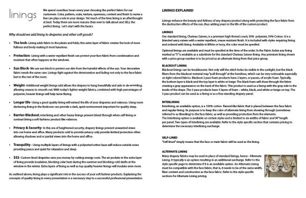 linings We spend countless hours every year choosing the perfect fabric for our customers . Color , pattern , scale , texture , openness , content and finish to name a few can play a role in your design . Yet much of the time lining is an afterthought at best . Today there are more reasons than ever to talk about and SELL the perfect lining . Let ’ s start with the basics .