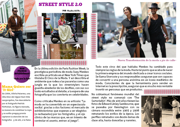 Como criticaba Menkes en su artículo: "La moda se ha convertido en un espectaculo socilal gracias a dos factores: el mercado de exhibicionistas que esperan a ser elegidos (o rechazados) por los fotógrafos, y el ojo clínico de las marcas que, en un intento de controlar el asunto, entran al juego".