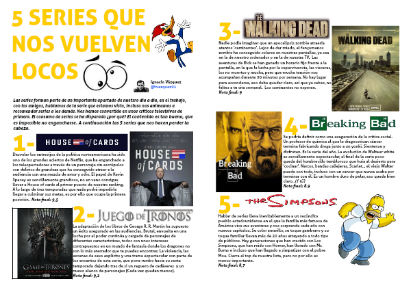 Se podría definir como una exageración de la crítica social. Un profesor de química al que le diagnostican cáncer termina fabricando droga junto a un yonki. Sientense y disfruten. Es la serie del año. La evolución de Walteer white es sencillamente espectacular, al final de la serie poco queda del hombrecillo tembloroso que huía al desierto para 'cocinar'. Narcos, bandas callejeras, Scarlet... el viejo Walter puede con todo, incluso con un cancer que nunca acaba por terminar con él. Es un hombre duro de pelar, eso queda bien claro. ¿Y tú?